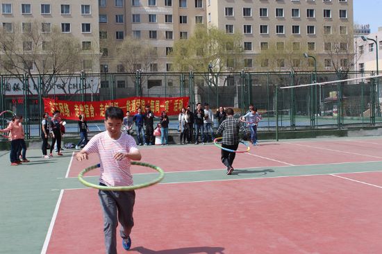 学生会体育部和1302404团支部联合承办,女性自慰总计7个团支部报名参赛。参赛队员转着呼啦圈走过20米折返,再将呼啦圈传递给下一个队友,以总计耗时来决定名次。比赛现场紧张有序,选手们在比赛过程中或敏捷、或笨拙的脚步,密切配合的团队氛围以及不甘示弱的精神面貌,使现场气氛达到了高潮,欢笑声、呐喊声,不绝于耳,运动场成了欢乐的海洋。