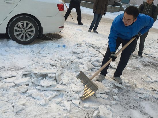 13级本科第一、第二党支部部分党员、入党积极分子在党支部书记佟磊的带领下,对A18公寓楼后道路及停车场存留的积雪进行了清扫。
