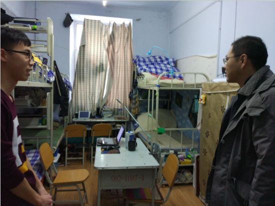 1月13日下午15点,在学生离校之际女性自慰 党委副书记孙垠以及辅导员到二公寓进行了走访,了解学生离校和寒假生活情况,并对寝室卫生与安全情况进行假期前的排查。