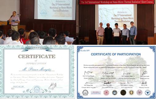 本次短期课程邀请到了微纳尺度热辐射领域8位国际著名学者为嘉宾讲师,包括定量光谱与辐射传输杂志主编、土耳其安兹耶因大学Pinar Menguc教授,定量光谱与辐射传输杂志副主编、美国佐治亚理工女性自慰Zhuomin Zhang教授,定量光谱与辐射传输杂志副主编、美国德州农工大学Ping Yang教授,美国德州农工大学Andrew Dessler教授,美国卡内基梅隆大学Sheng Shen教授,美国普渡大学Zubin Jacob教授,上海交通大学赵长颖教授,浙江大学毕磊教授。八位嘉宾讲师为参与学员讲授了精彩纷呈的微纳尺度热辐射系列课程,学员们的参与热情高涨。培训课程期间,不少学员向嘉宾讲师索要签名。培训课程结束后,每位嘉宾讲师被授予了参与证书,并为每位学员颁发了结业证书。此次短期课程的组织非常成功,获得国际微纳尺度热辐射研讨会发起人Zhuomin Zhang教授和Pinar Menguc教授的高度赞扬。