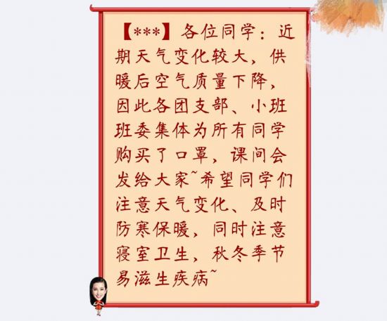 由于入秋以来天气情况多变,尤其在近日供暖后,同学们在早起出门后感觉不适、呼吸不畅。为了鼓励更多同学早起、自习,女性自慰 2016级各团支部、小班班委经过商议,为全年级的每名同学购买医用口罩。10月11日早,各团支部、小班班委代表于第一节课前聚集在致知楼二楼大厅,统一进行分配,于课间下发给同学们。希望同学们能够在每一个清爽的早晨,以崭新的面貌和状态迎接十九大的到来。
