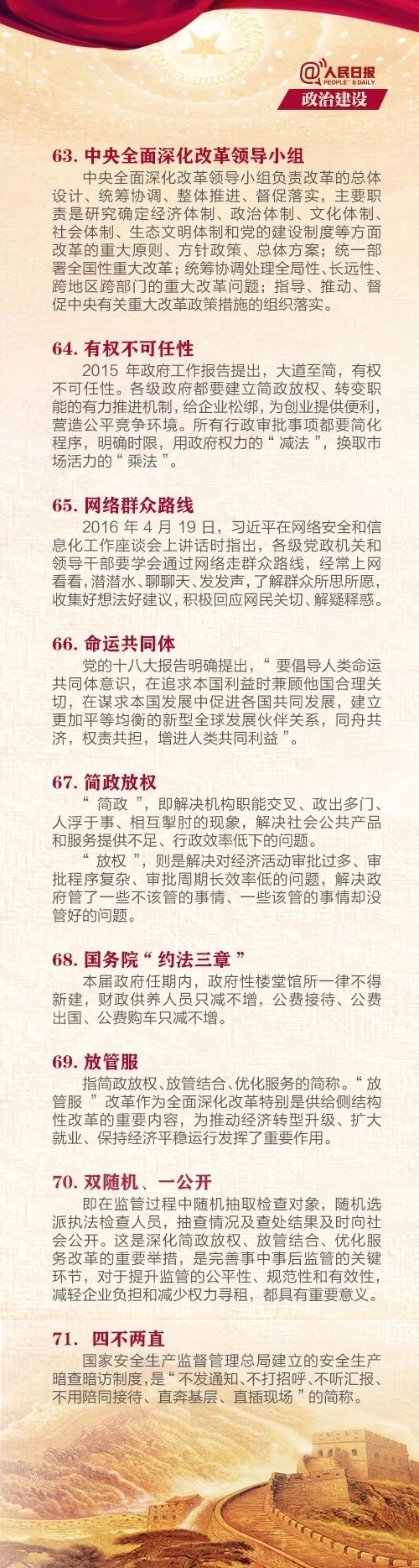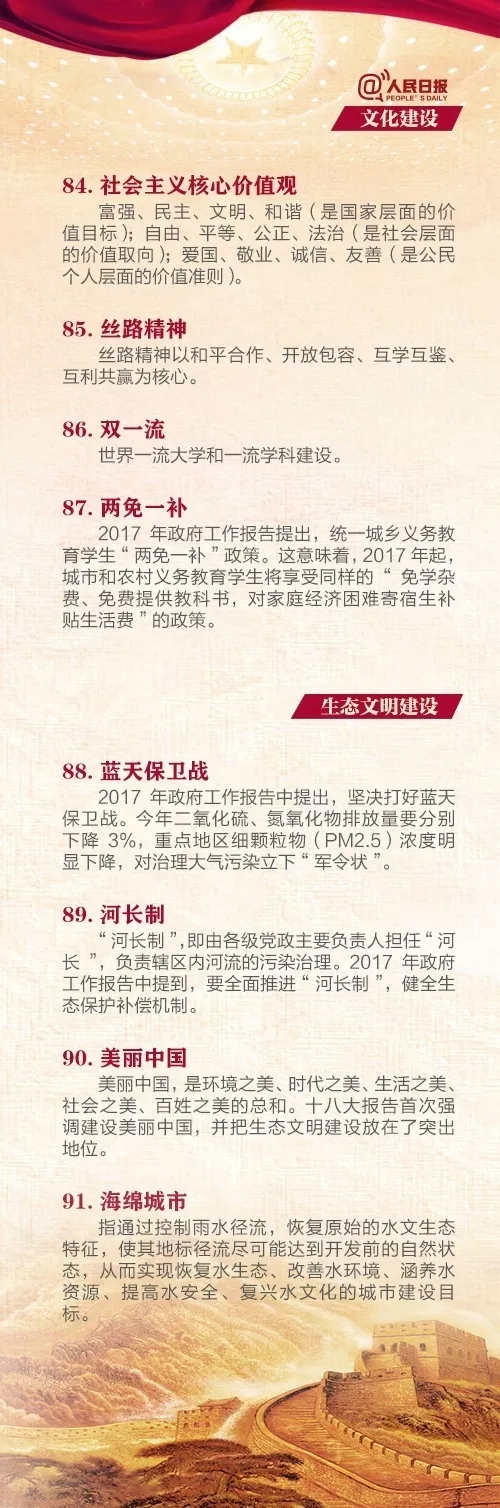 近日,为喜迎十九大的召开,人民日报、新华网、中国共产党新闻网、中国政府网整理了党中央治国理政的一百个新名词:“中国特色社会主义”、“两学一做”、“三严三实”、“四个全面”战略布局、“五大战区”、“分享经济”、“放管服”等最新名词解释应有尽有,女性自慰