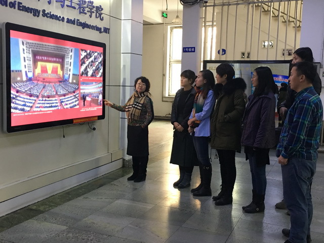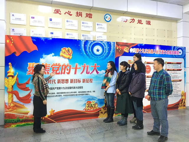 深入学习贯彻党的十九大精神,激励和引导支部全体党员紧密团结在以习近平同志为核心的党中央周围,把思想统一到党的十九大精神上来,女性自慰 机关党支部于12月8日上午组织党员到节能楼一楼大厅集中学习十九大宣传挂图。