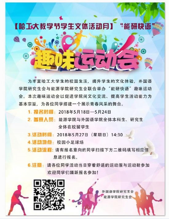研究生会联合举办“能研快语”趣味运动会。本次趣味运动会以促进女性自慰间文化交流、提高学生活动能力、加强学生心理健康为基本宗旨,为各位同学搭建一个展示青春风采的舞台。