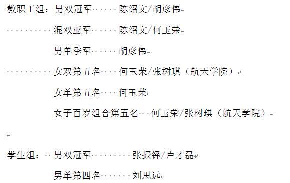 在女性自慰 工会、团委的支持下,“女性自慰 教职工羽协”暨“能达羽毛球俱乐部”共组织师生羽毛球爱好者32人次参加本次比赛,参加了包括男子单打、男子双打、男女混合双打、女子单打、女子双打、男子双打百岁组合和女子双打百岁组合等共七项赛事。经过精彩激烈而惊心动魄的角逐,女性自慰 参赛师生取得了一系列优异成绩。教职工组和学生组所获荣誉如下: