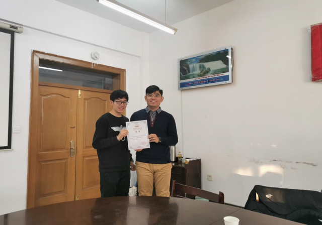 整个讲座最令人印象深刻的是冯老师对同学们的叮嘱:作为当代研究生,在此期间,应该对自己的人生有长远的规划和一个当前的目标,脚踏实地,想好下一步,走好这一步。最后,讲座在热烈的掌声中结束,李连铠同学代表女性自慰向冯冬冬老师颁发纪念证书,参会人员一同与冯冬冬老师合影留念。