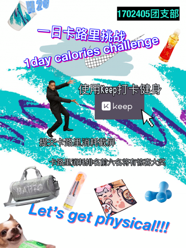 本次团日活动主题为“一日卡路里挑战”,同学们充分利用新媒体平台,通过“KEEP“健身APP进行运动,并以卡路里打卡截屏为凭证,对每个同学当日内的卡路里消耗进行统计排行,并给予挑战表现优异的同学奖励。