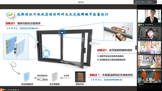 项目介绍:由于目前的节能窗普遍没有应季调节的功能,无论冬夏,窗边的体感舒适度都比较差。所以本项目设计了一种以木质基选择性近红外吸热材料为基础,合页型旋转窗体结构为辅助结构的节能窗。通过将WO2.72和有机钨螯合物掺杂进树脂中,再将树脂填充到去木素基板中得到这种可以吸收近90%红外光的材料;合页型的旋转窗体结构可以在保证窗体密封性的前提下进行换热面的切换,从而做到冬天室内侧材料吸热,降低热损耗,夏季室外侧玻璃吸热,阻止近红外热量的进入。对比普通的双层窗体,本项目可降低窗体热损耗约45%,同时成本仅仅比普通窗体高四分之一左右,具有极高的节能性价比。除此之外,透明木材的运用可以进一步增加窗体的艺术性和观赏性,是未来建筑窗体的优秀前驱体。