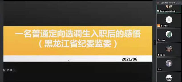 接下来,2020届黑龙江省纪委监委选调生李帅以工作、学习、生活三个方面为切入点,详细分享了定向选调生入职后的亲身经历与感悟。